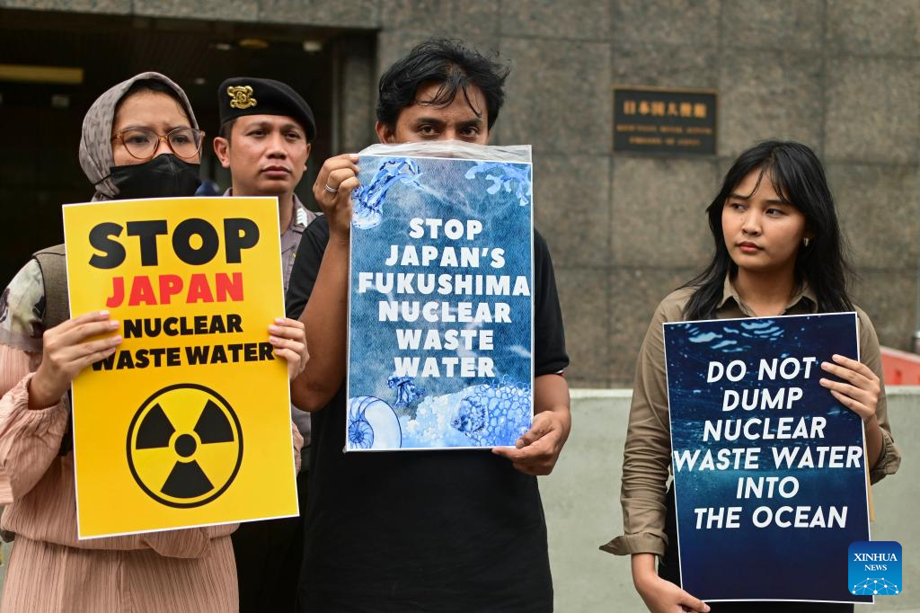 People protest against Japan's discharging contaminated water into the ocean outside the Japanese embassy in Jakarta, Indonesia, Jan. 15, 2024. (Xinhua/Zulkarnain)