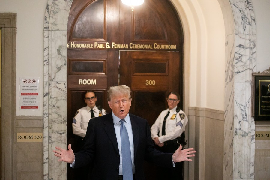 Former U.S. President Donald Trump (Front) speaks to the media outside the courtroom during his civil fraud trial at New York State Supreme Court in New York, the United States, on Oct. 18, 2023. (Photo by Michael Nagle/Xinhua)