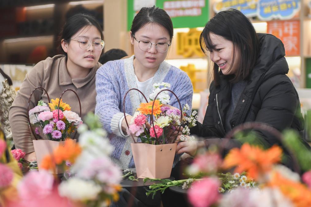 Students learn floral art during a night school class in Wuhan East Lake High-tech Development Zone of Wuhan, central China's Hubei Province, Jan. 14, 2024. (Xinhua/Du Zixuan)