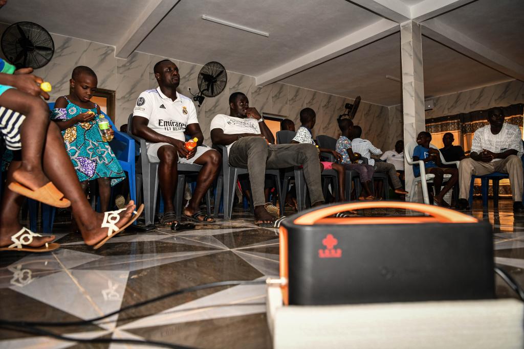 People watch the 2023 Africa Cup of Nations (AFCON) matches with the help of China's satellite TV project in Yaou village, Cote d'Ivoire, Jan. 14, 2024. (Xinhua/Han Xu)
