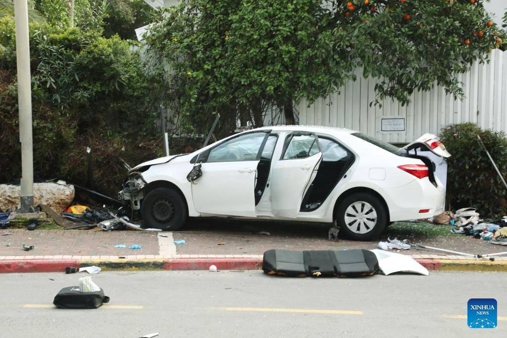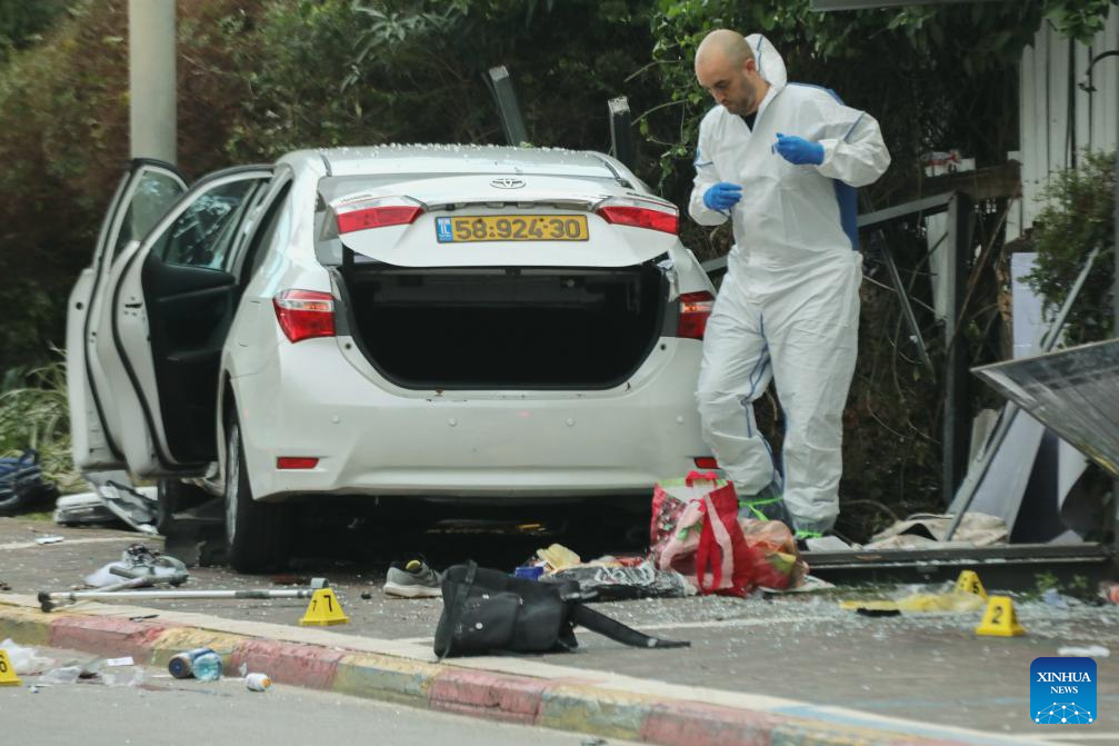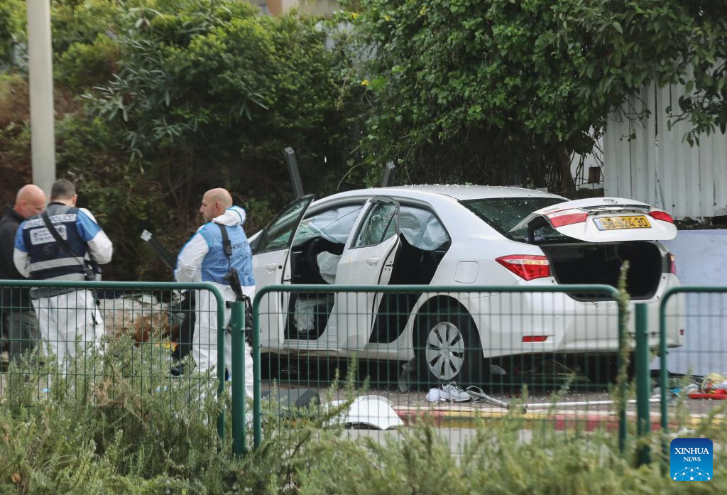 Photo taken on Jan. 15, 2024 shows the scene of car-ramming and stabbing attacks in the central Israeli city of Ra'anana. Combined car-ramming and stabbing attacks carried out by two Palestinians killed an elderly woman and wounded 17 others in central Israel on Monday, Israeli authorities said. (Gideon Markowicz/JINI via Xinhua)