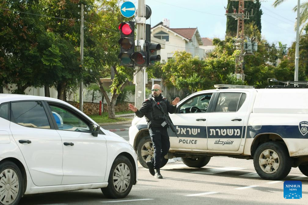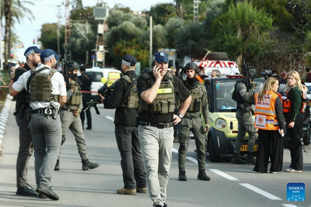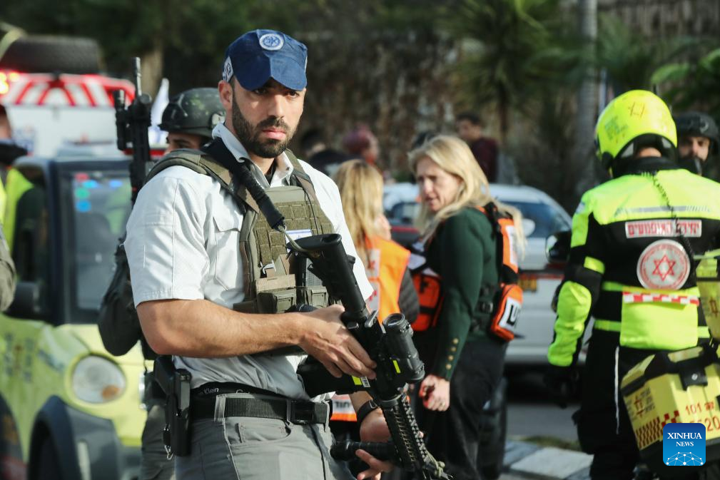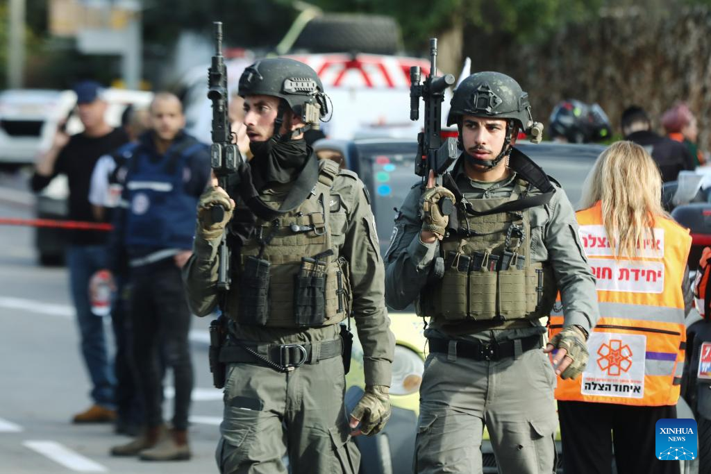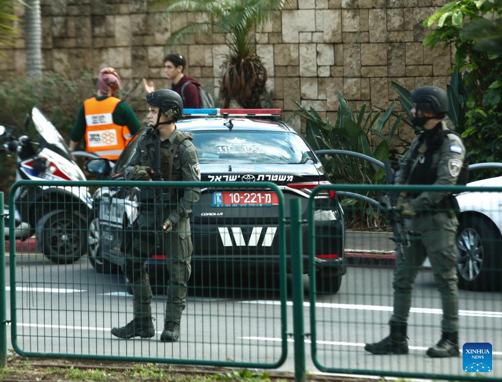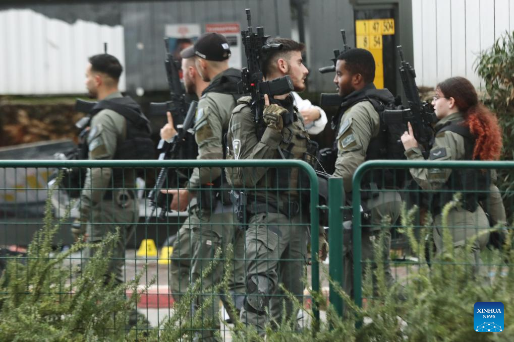 Israeli security forces stand guard at the scene of car-ramming and stabbing attacks in the central Israeli city of Ra'anana, on Jan. 15, 2024. Combined car-ramming and stabbing attacks carried out by two Palestinians killed an elderly woman and wounded 17 others in central Israel on Monday, Israeli authorities said. (Gideon Markowicz/JINI via Xinhua)