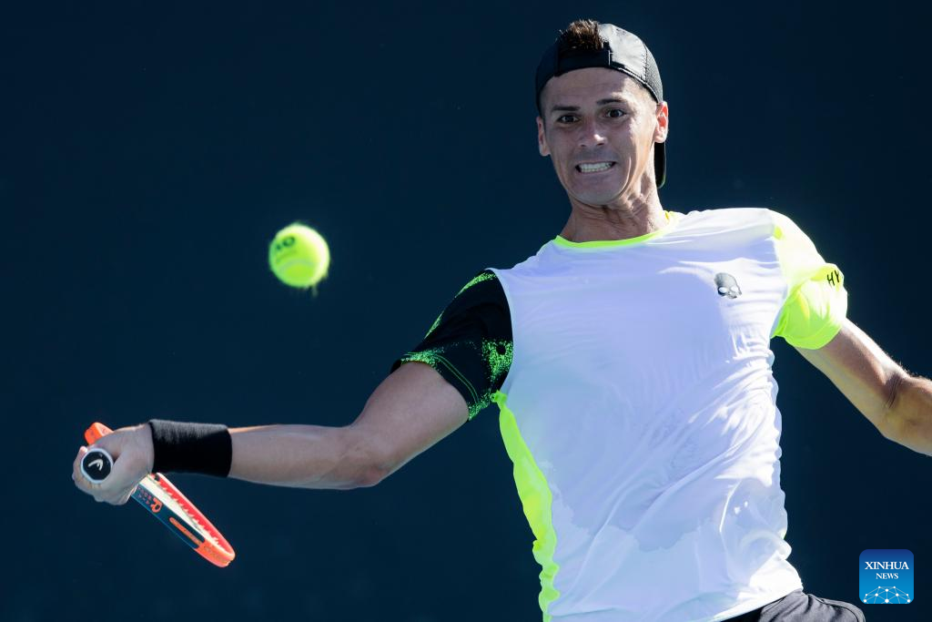 Federico Coria of Argentina hits a return during the men's singles first round match between Zhang Zhizhen of China and Federico Coria of Argentina at Australian Open tennis tournament in Melbourne, Australia, Jan. 15, 2024. (Photo by Chu Chen/Xinhua)