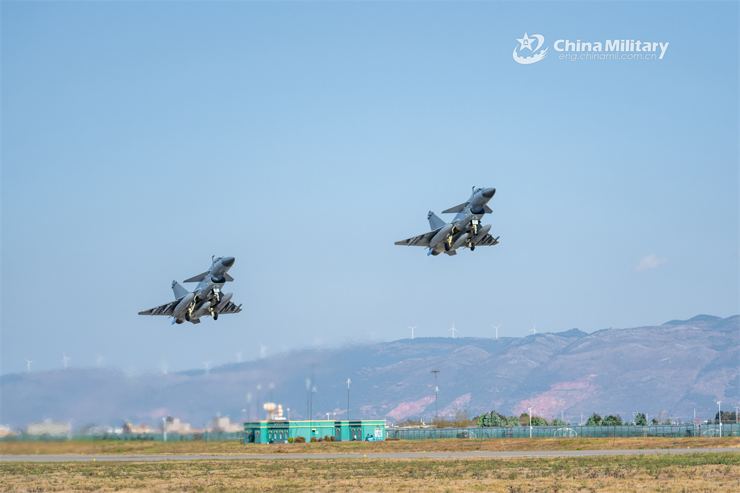 Two J-10 fighter jets attached to an aviation brigade with the air force under PLA Southern Theater Command take off in formation during a flight training exercise on December 25, 2023. (eng.chinamil.com.cn/Photo by Shang Jieyan)