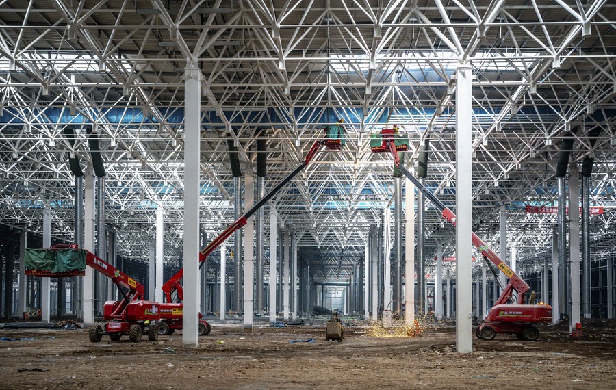 This aerial photo taken on Jan. 31, 2023 shows a construction site of the Audi-FAW new energy vehicle (NEV) project in Changchun, northeast China's Jilin Province. (Photo by Wang Meng/Xinhua)