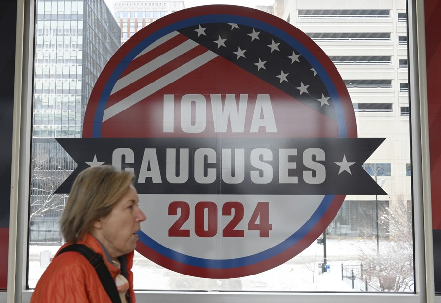 A pedestrian walks past a sign of 2024 Iowa caucuses in Des Moines, Iowa, the United States, Jan. 15, 2024. (Xinhua)