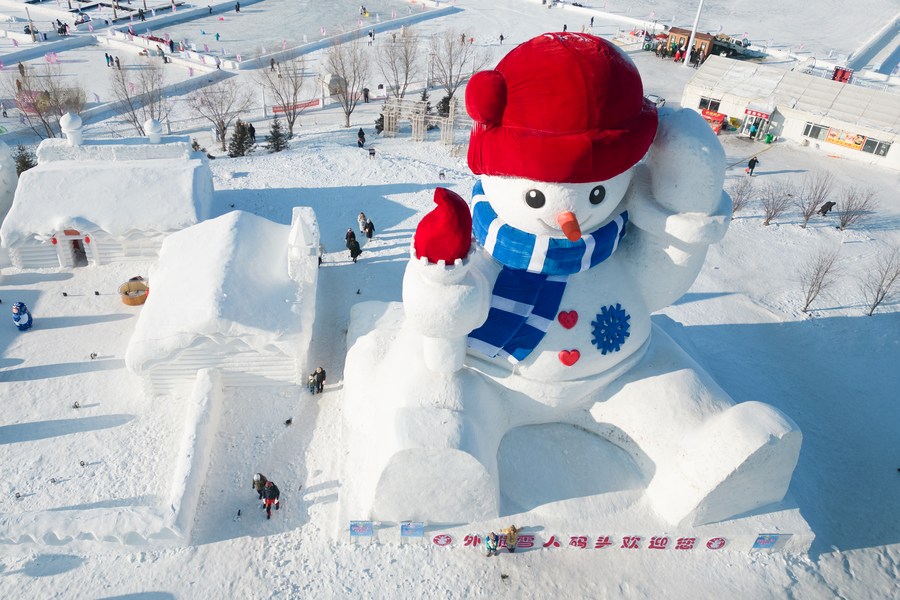An aerial drone photo taken on Jan. 9, 2024 shows tourists having fun near a giant snowman in Harbin, northeast China's Heilongjiang Province. (Xinhua/Zhang Tao)
