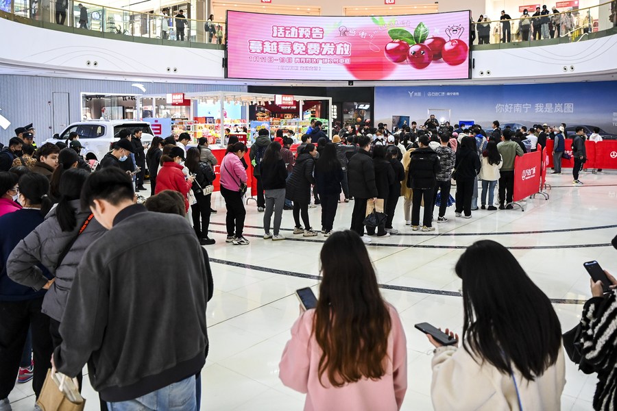 People line up to get cranberries distributed for free from northeast China's Heilongjiang Province at a distribution site in Nanning, south China's Guangxi Zhuang Autonomous Region, Jan. 11, 2024. (Xinhua/Cao Yiming)