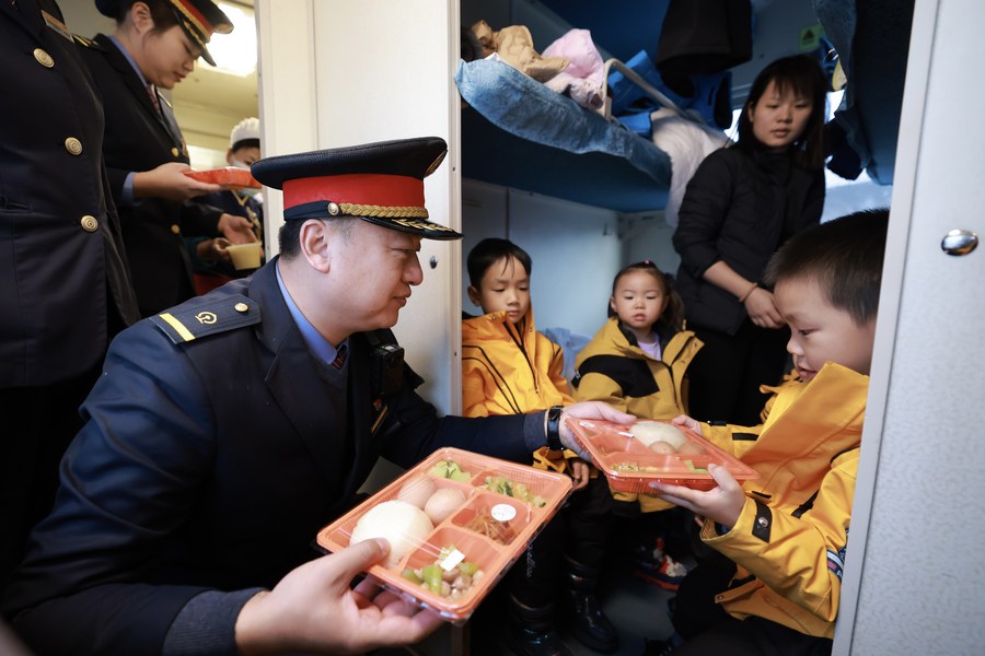 Chief conductor Zhang Yong delivers breakfast for kids from south China's Guangxi Zhuang Autonomous Region on the train K7042 that links Mohe and Harbin in northeast China's Heilongjiang Province, Jan. 6, 2024. These kids, nicknamed "little tangerines" referring to a specialty produce of their native Guangxi, quickly went viral among netizens as they embarked on a "brave" camp trip to northeast China. (Photo by Xu Shuai/Xinhua)