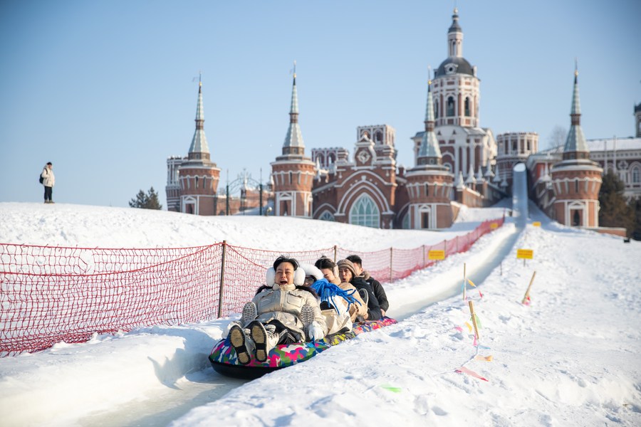 People enjoy themselves at the Volga Manor in Harbin, northeast China's Heilongjiang Province, Jan. 7, 2024. (Xinhua/Zhang Tao)
