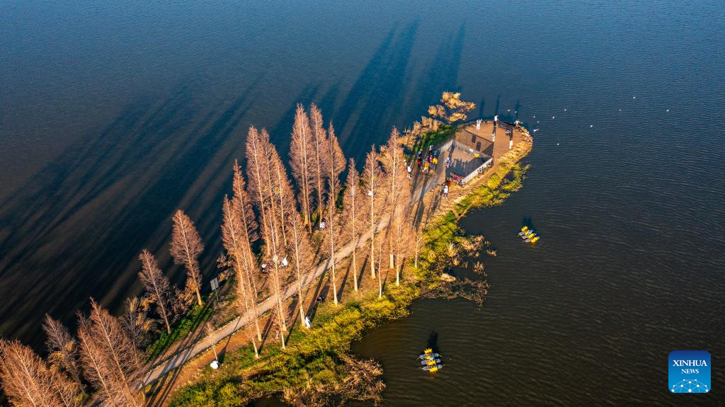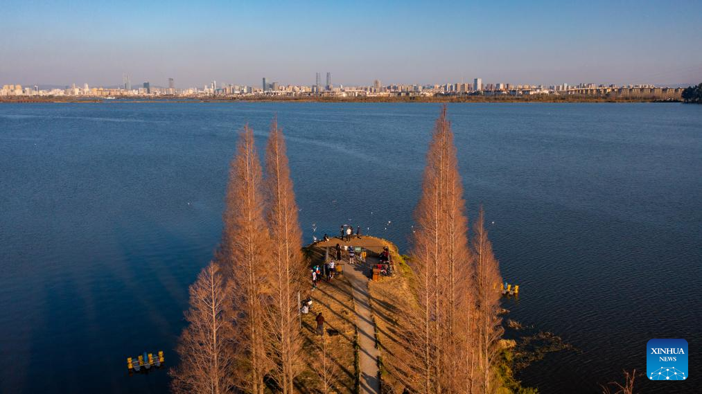 An aerial drone photo taken on Jan. 13, 2024 shows tourists enjoying the scene by the Dianchi Lake in Kunming, southwest China's Yunnan Province. The overall water quality of Dianchi Lake has been maintained for six consecutive years since it reached Class IV in the country's five-tier evaluation system for the first time in 2018. (Xinhua/Hu Chao)