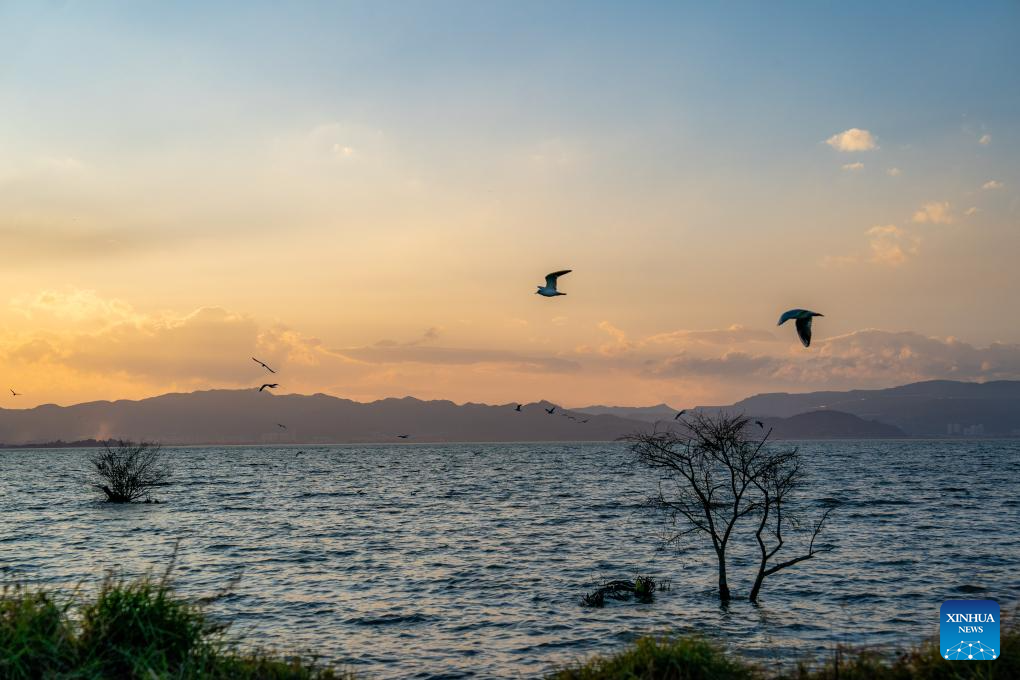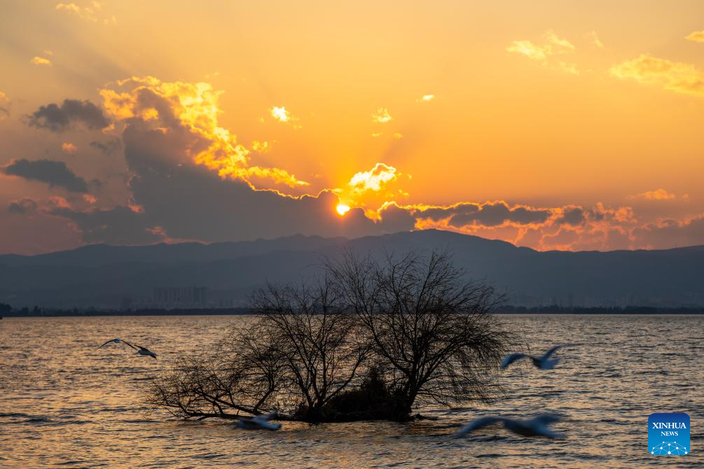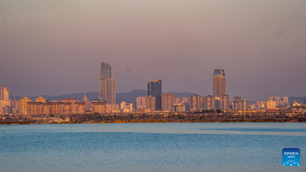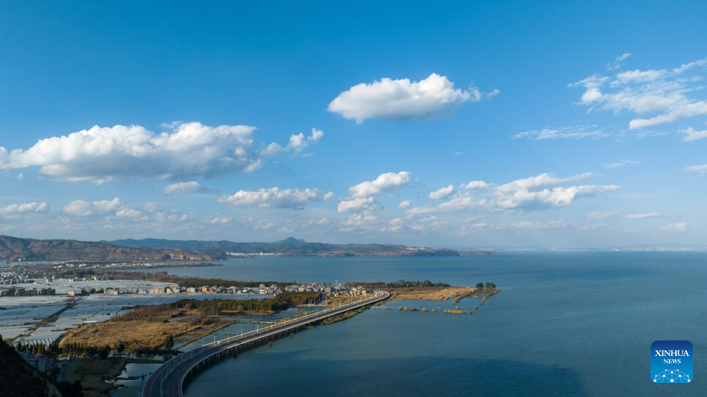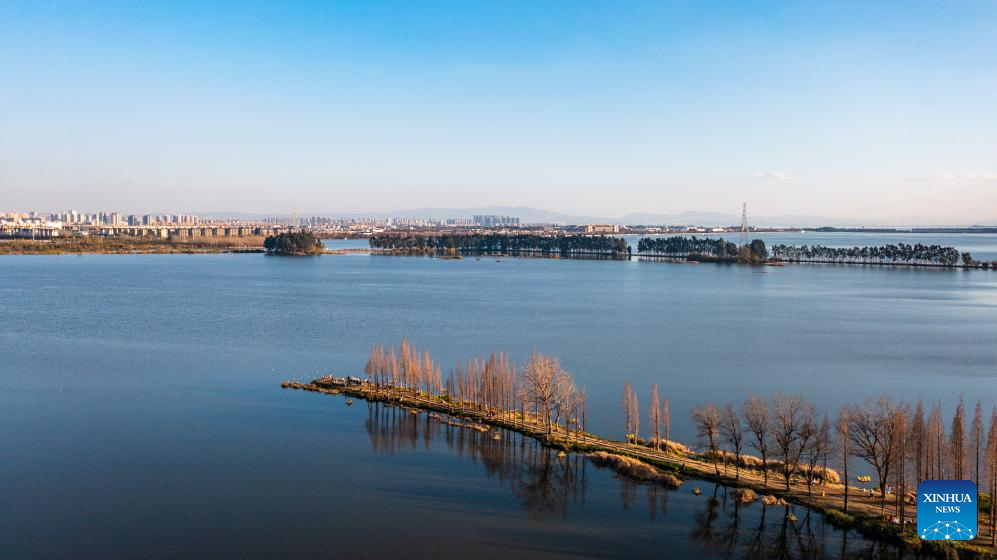 This photo taken on Jan. 15, 2024 shows a view of the Dianchi Lake in Kunming, southwest China's Yunnan Province. The overall water quality of Dianchi Lake has been maintained for six consecutive years since it reached Class IV in the country's five-tier evaluation system for the first time in 2018. (Xinhua/Hu Chao)