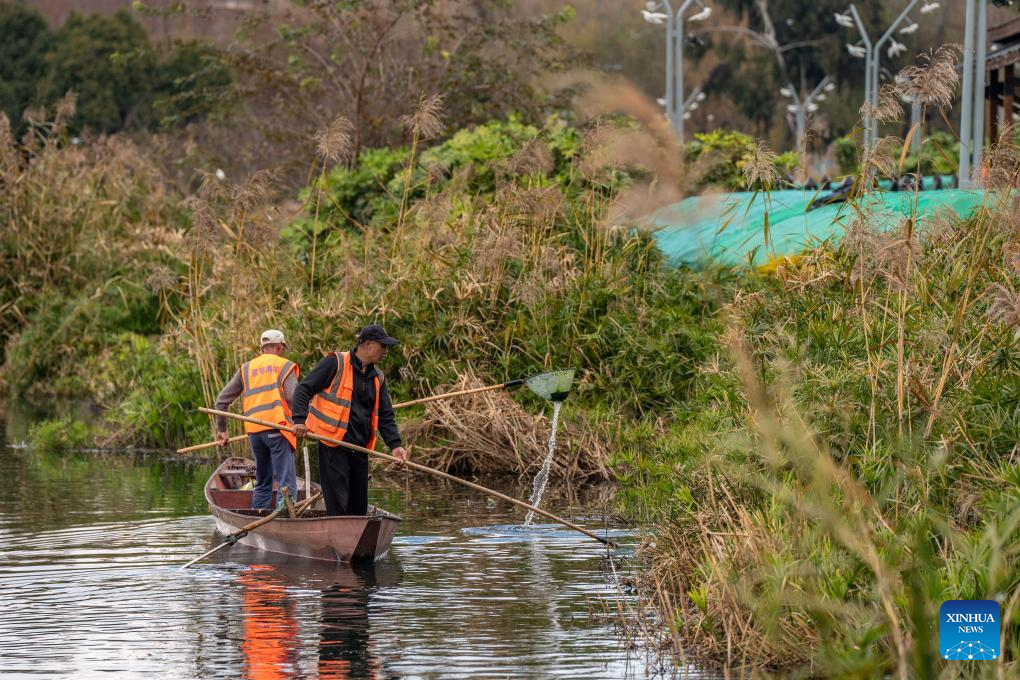 Staff members collect litter in the Dianchi Lake in Kunming, southwest China's Yunnan Province, Jan. 16, 2024. The overall water quality of Dianchi Lake has been maintained for six consecutive years since it reached Class IV in the country's five-tier evaluation system for the first time in 2018. (Xinhua/Hu Chao)