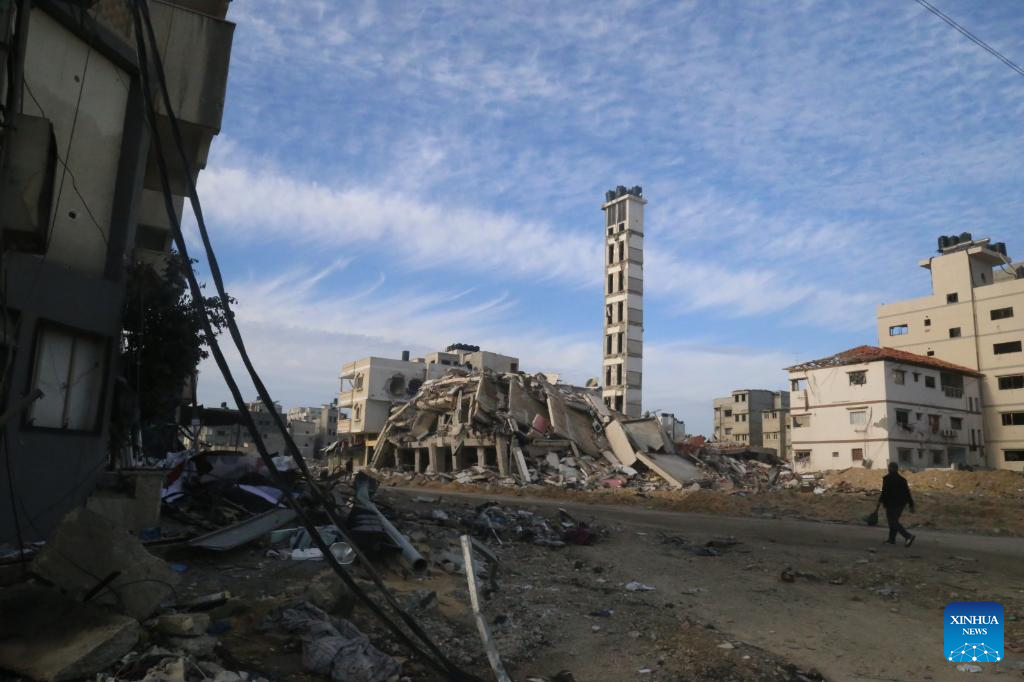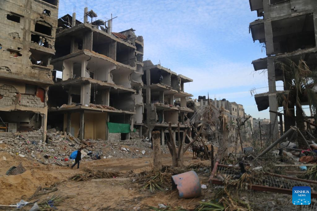 A person walks past destroyed buildings in Gaza City, on Jan. 15, 2024. The Palestinian death toll from ongoing Israeli attacks on the Gaza Strip has risen to 24,285, the Gaza-based Health Ministry said on Tuesday. (Photo by Abdul Rahman Salama/Xinhua)