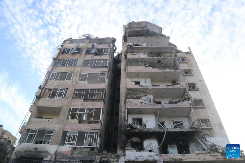 Photo taken on Jan. 15, 2024 shows a damaged building in Gaza City. The Palestinian death toll from ongoing Israeli attacks on the Gaza Strip has risen to 24,285, the Gaza-based Health Ministry said on Tuesday. (Photo by Abdul Rahman Salama/Xinhua)