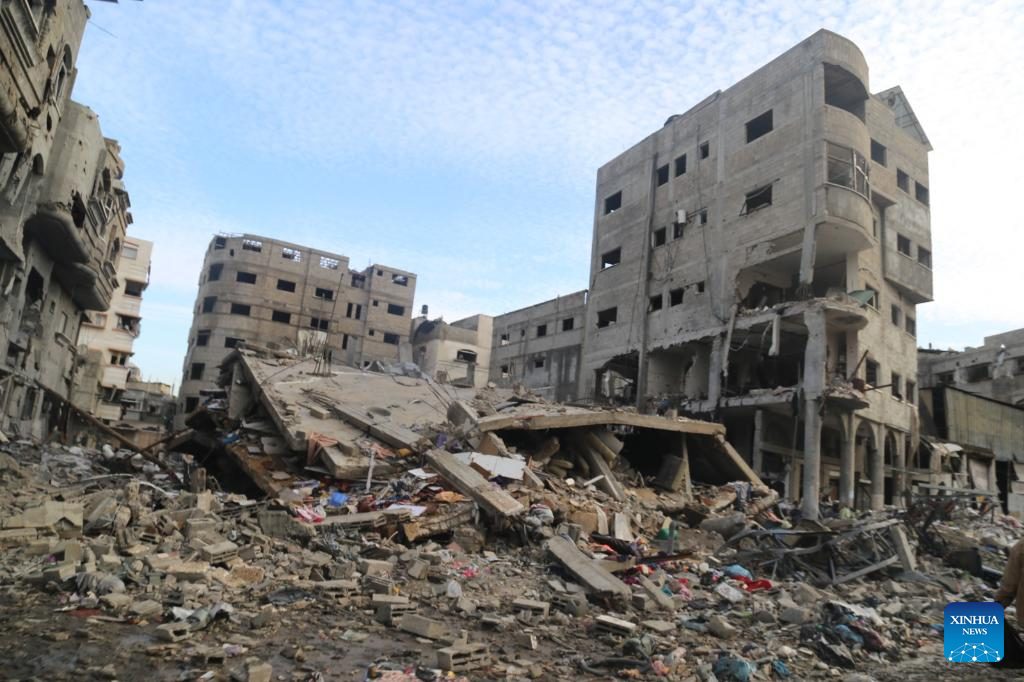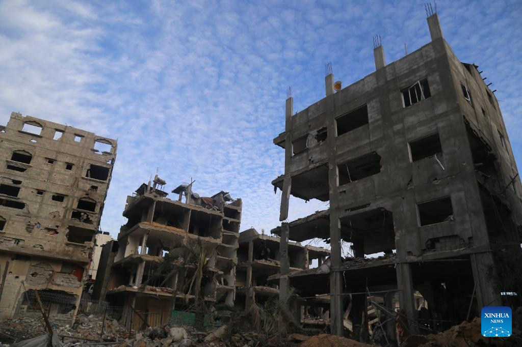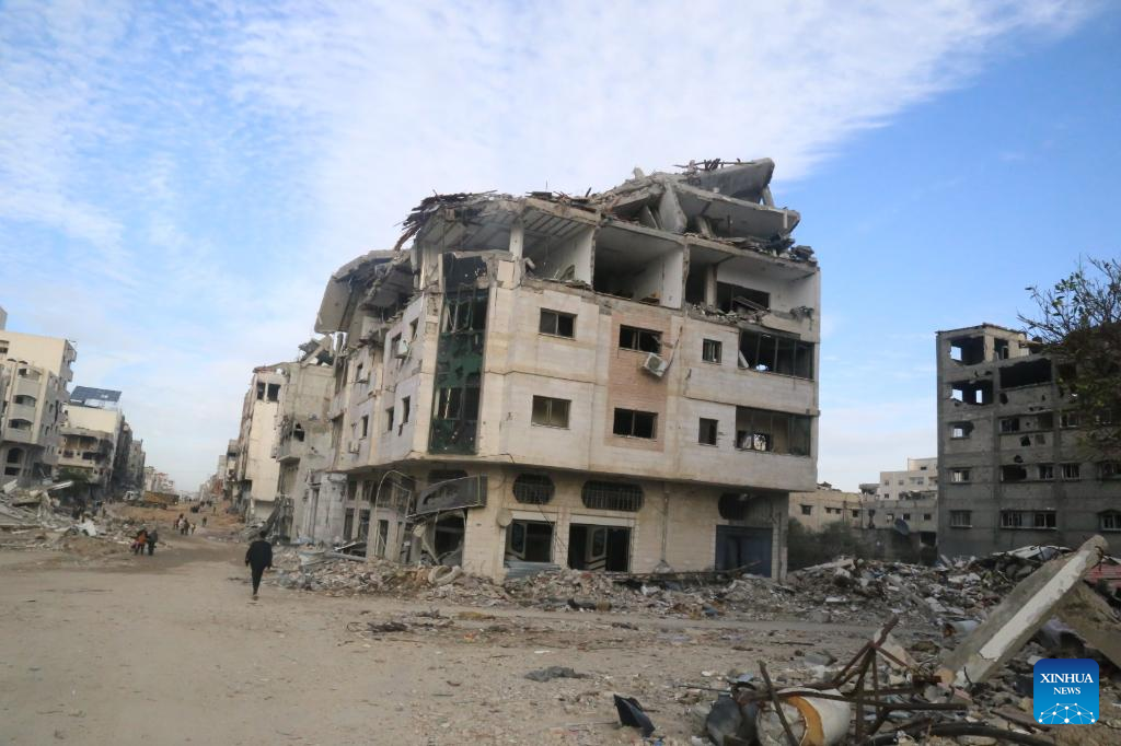 Photo taken on Jan. 15, 2024 shows destroyed buildings in Gaza City. The Palestinian death toll from ongoing Israeli attacks on the Gaza Strip has risen to 24,285, the Gaza-based Health Ministry said on Tuesday. (Photo by Abdul Rahman Salama/Xinhua)