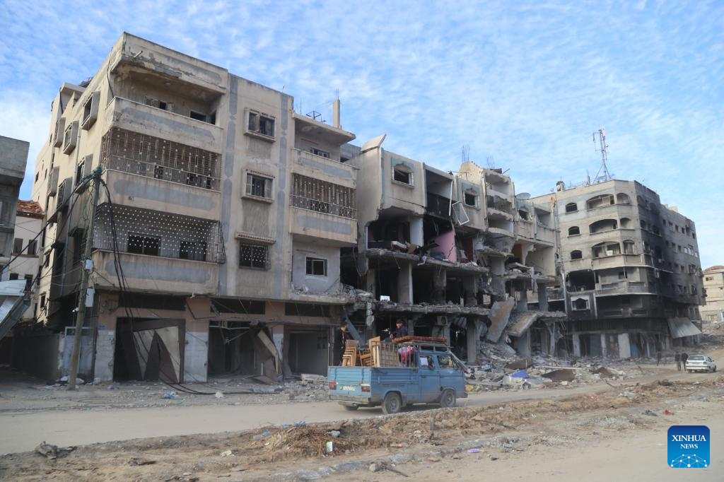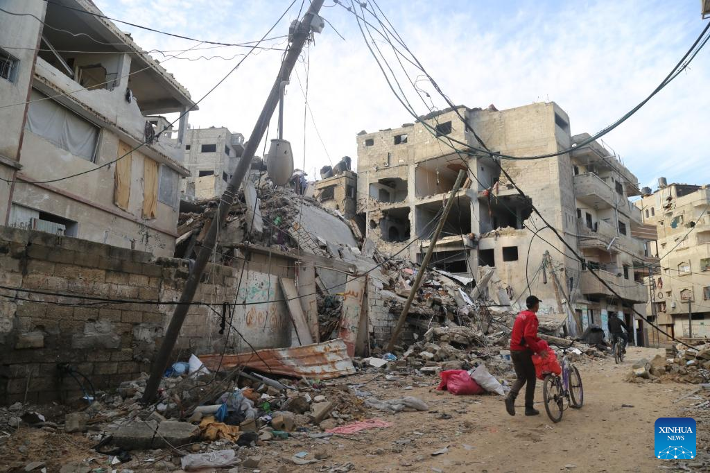 People are seen on a street with damaged buildings in Gaza City, on Jan. 15, 2024. The Palestinian death toll from ongoing Israeli attacks on the Gaza Strip has risen to 24,285, the Gaza-based Health Ministry said on Tuesday. (Photo by Abdul Rahman Salama/Xinhua)