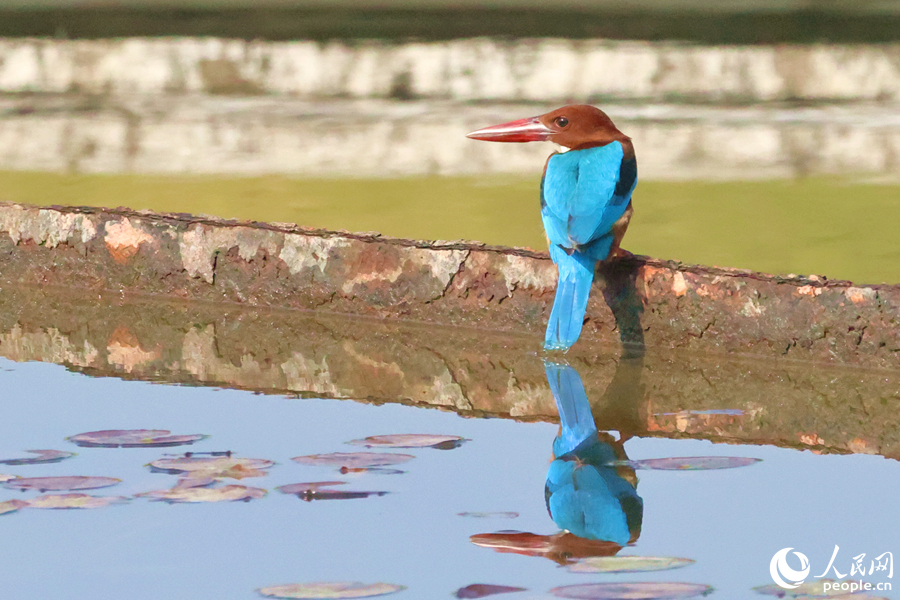 A white-throated kingfisher and its reflection create a picturesque image. (People's Daily Online/Chen Bo)