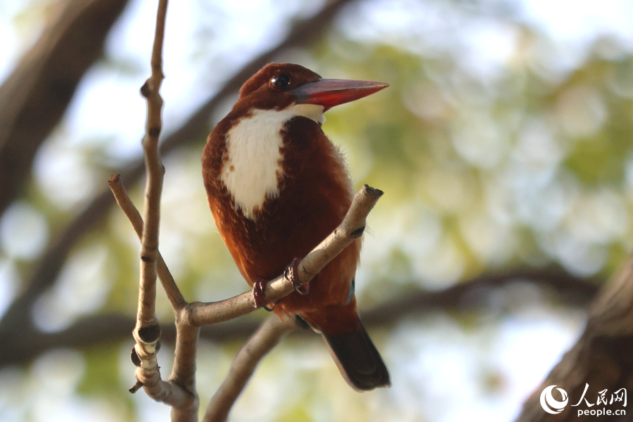 A white-throated kingfisher perches on a tree branch. (People's Daily Online/Chen Bo)