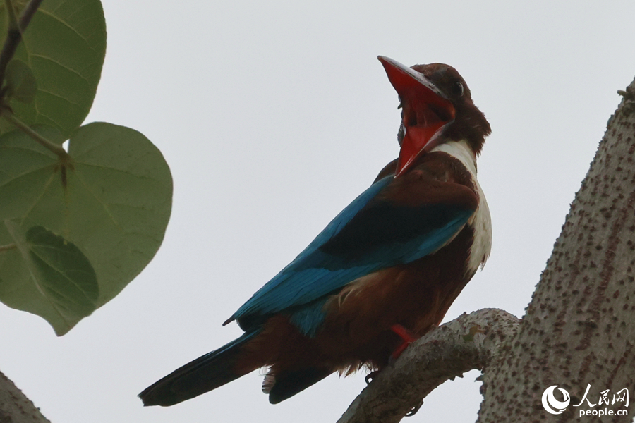 A white-throated kingfisher chirps on a tree branch. (People's Daily Online/Chen Bo)