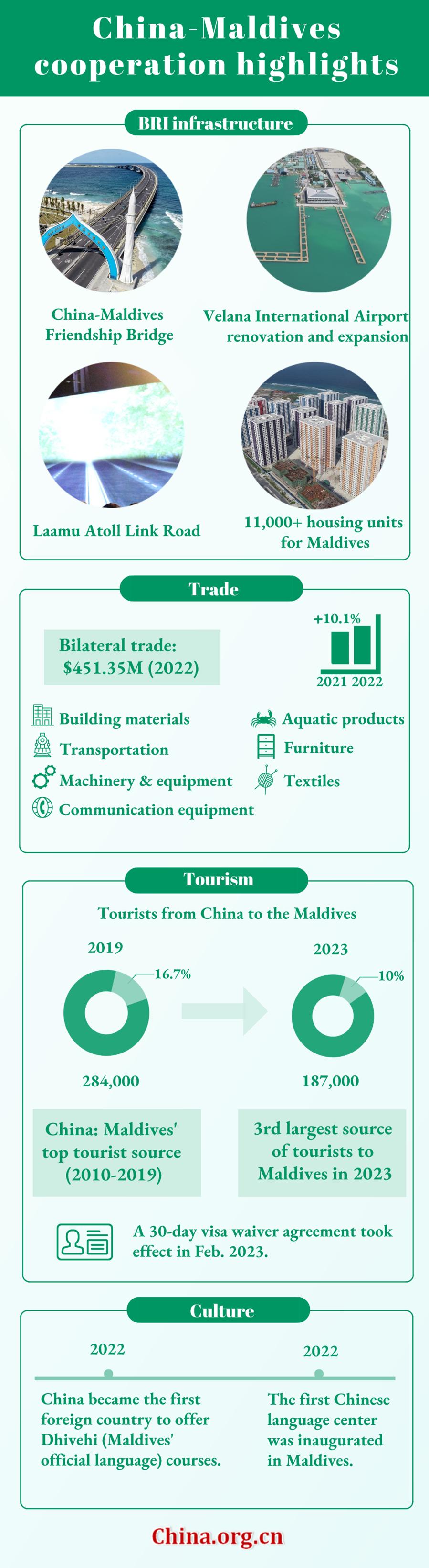 Editor's note: Despite their geographical distance, China and the Maldives are engaged in various forms of cooperation, particularly in the areas of trade, infrastructure and tourism. Let's explore the burgeoning collaboration and shared progress between the two countries.