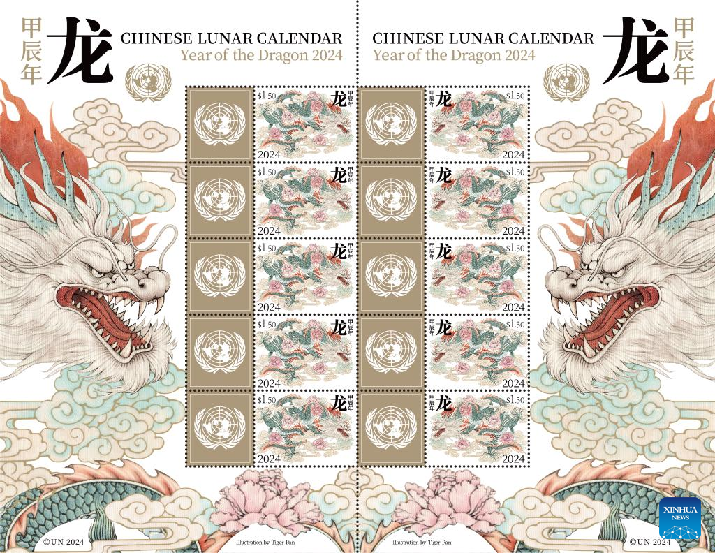 The stamp sheet, to be issued on Friday according to the UNPA's program, consists of 10 stamps of a denomination of 1.50 U.S. dollars each, with a dragon flying in clouds, as the Chinese lunar year for 2024 is the Year of the Dragon.