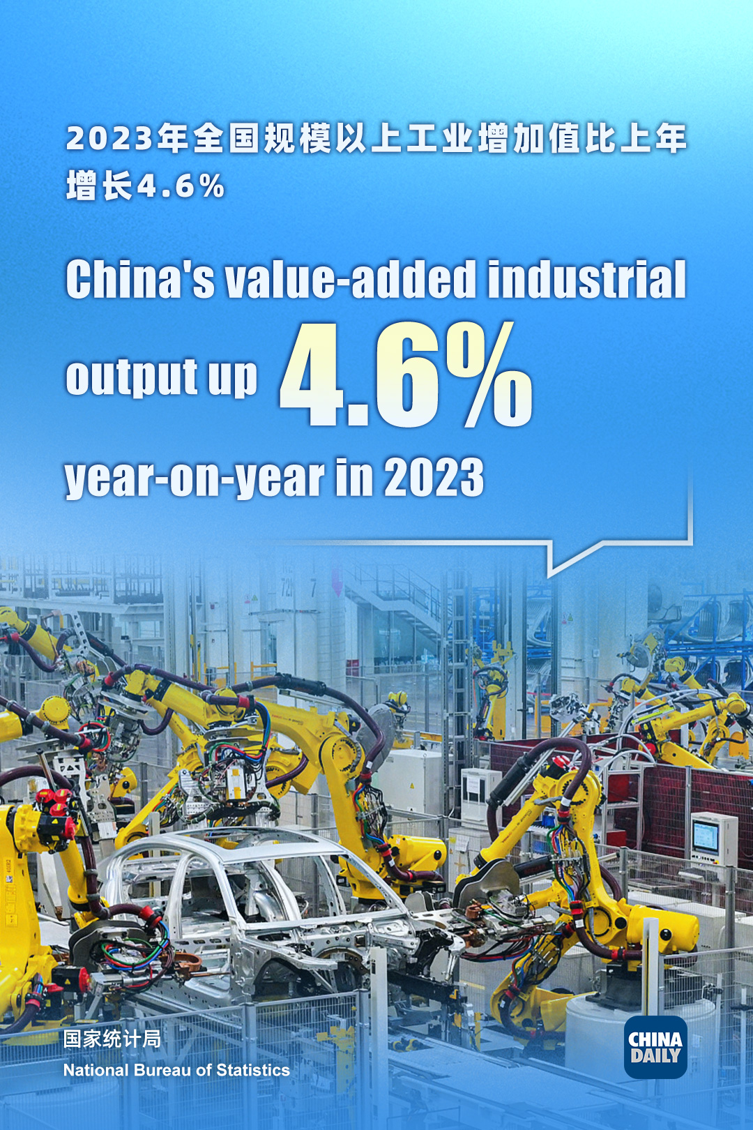 China's value-added industrial output grew by 4.6 percent year-on-year in 2023. The figure rose by 6.8 percent in December after a 6.6 percent growth in November.