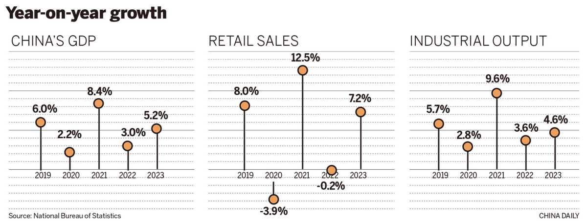 Data from the National Bureau of Statistics showed on Wednesday that China's GDP expanded by 5.2 percent year-on-year in 2023 to 126.06 trillion yuan ($17.63 trillion), surpassing the country's preset annual growth target of around 5 percent.