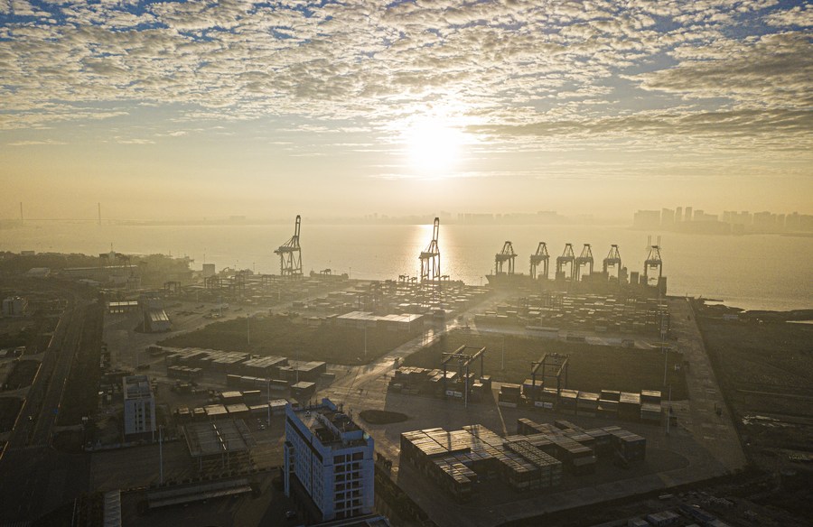 An aerial drone photo taken on Jan. 1, 2024 shows the Yangpu Economic Development Zone at sunrise, south China's Hainan Province. (Xinhua/Pu Xiaoxu)