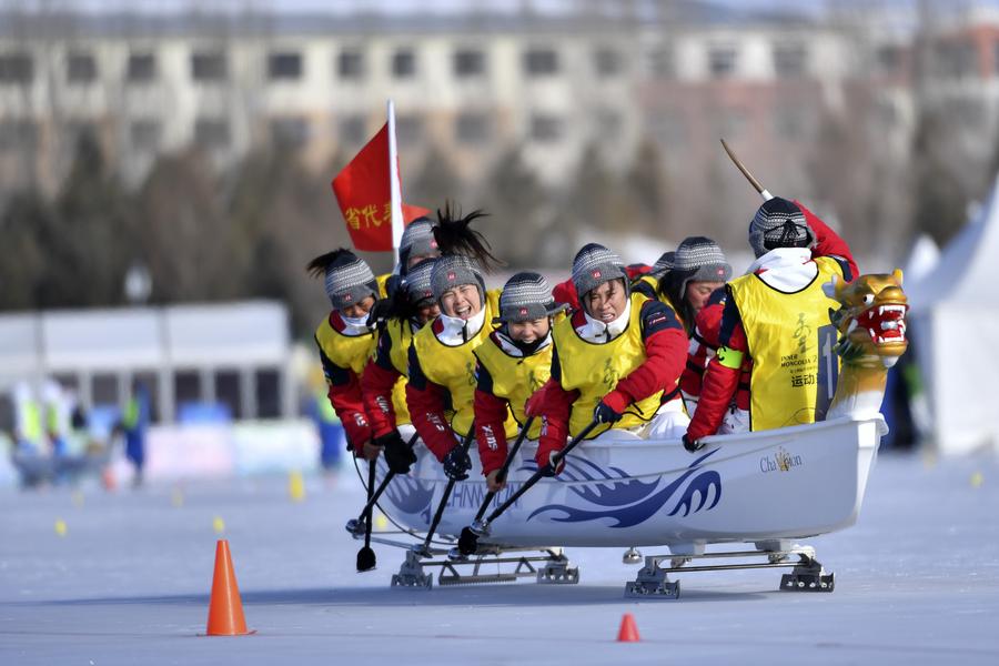 Players of Team Jilin compete during the women's 200m straight race final of ice dragon boat of the 14th Chinese National Winter Games in Duolun County of north China's Inner Mongolia Autonomous Region, Jan. 12, 2020. (Photo by Bei He/Xinhua)