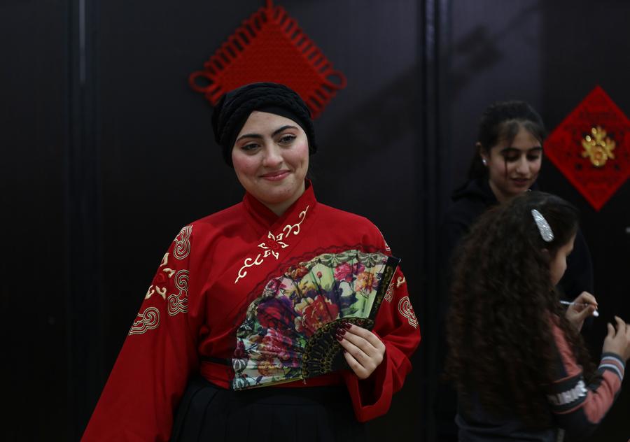 A student shows traditional Chinese costume during a cultural event for the upcoming Chinese Spring Festival at Philadelphia University in Jordan in Amman, Jordan, on Jan. 16, 2024. (Photo by Mohammad Abu Ghosh/Xinhua)
