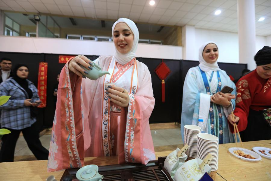 A student experiences the art of Chinese tea during a cultural event for the upcoming Chinese Spring Festival at Philadelphia University in Jordan in Amman, Jordan, on Jan. 16, 2024. (Photo by Mohammad Abu Ghosh/Xinhua)