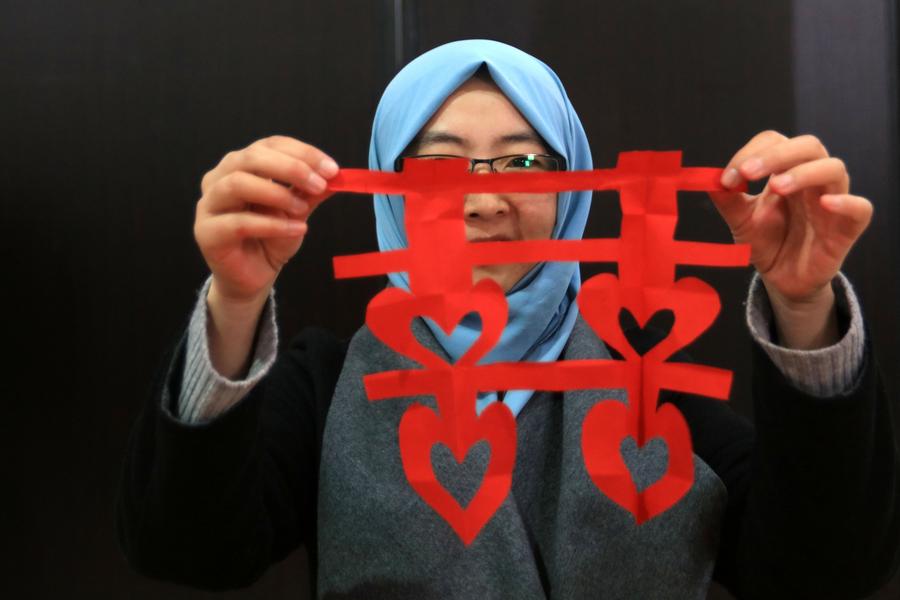 A teacher shows a piece of paper cutting work during a cultural event for the upcoming Chinese Spring Festival at Philadelphia University in Jordan in Amman, Jordan, on Jan. 16, 2024. (Photo by Mohammad Abu Ghosh/Xinhua)
