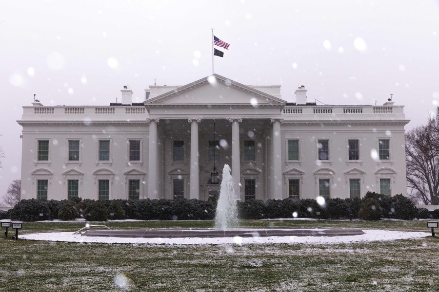 The White House is seen during a snowfall in Washington, D.C., the United States, Jan. 15, 2023. (Photo by Aaron Schwartz/Xinhua)