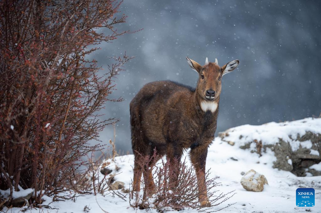 Himalayan gorals are pictured in Shannan City of southwest China's Xizang Autonomous Region, Jan. 17, 2024. (Xinhua/Tenzing Nima Qadhup)