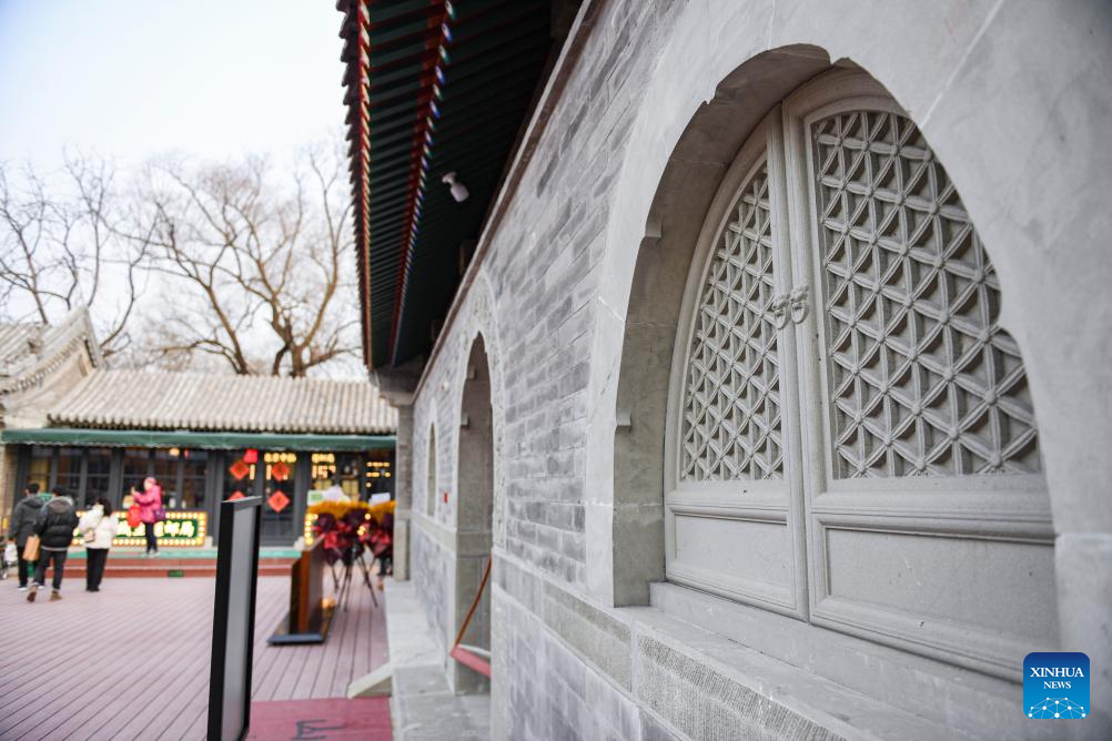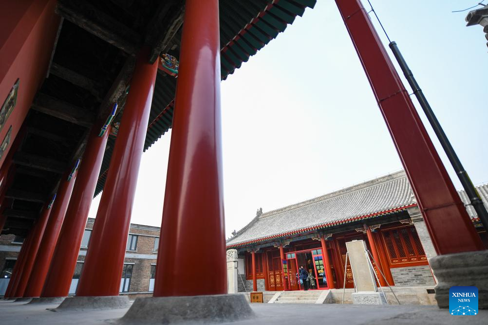 People visit an exhibition at Hong'en Temple in Beijing, capital of China, Jan. 18, 2024. The over 700-year-old Hong'en Temple opened to public recently. It is located to the north of the Bell Tower in Beijing, with Beijing Central Axis passing through its west annex hall.