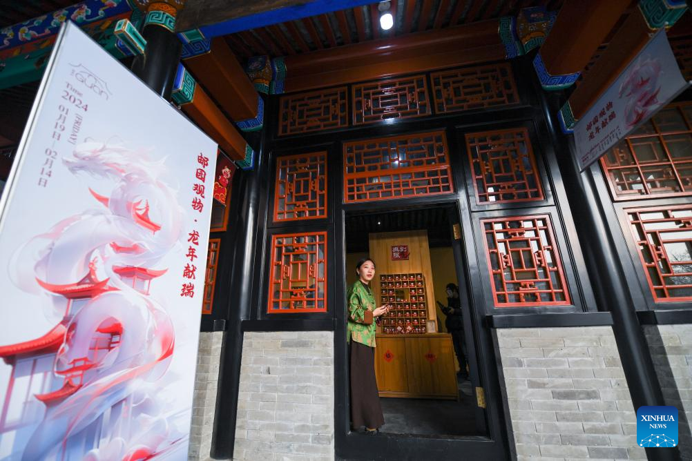 This photo taken on Jan. 18, 2024 shows a store where cultural products are on sale at the Hong'en Temple in Beijing, capital of China. The over 700-year-old Hong'en Temple opened to public recently. It is located to the north of the Bell Tower in Beijing, with Beijing Central Axis passing through its west annex hall.