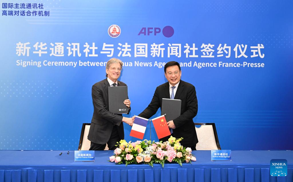 Xinhua News Agency President Fu Hua and AFP Chairman and Chief Executive Officer Fabrice Fries jointly signed the MoU. This is the first concrete cooperation outcome achieved since the establishment of a high-level dialogue and cooperation mechanism for major international wire services within the framework of the World Media Summit (WMS) in December last year.