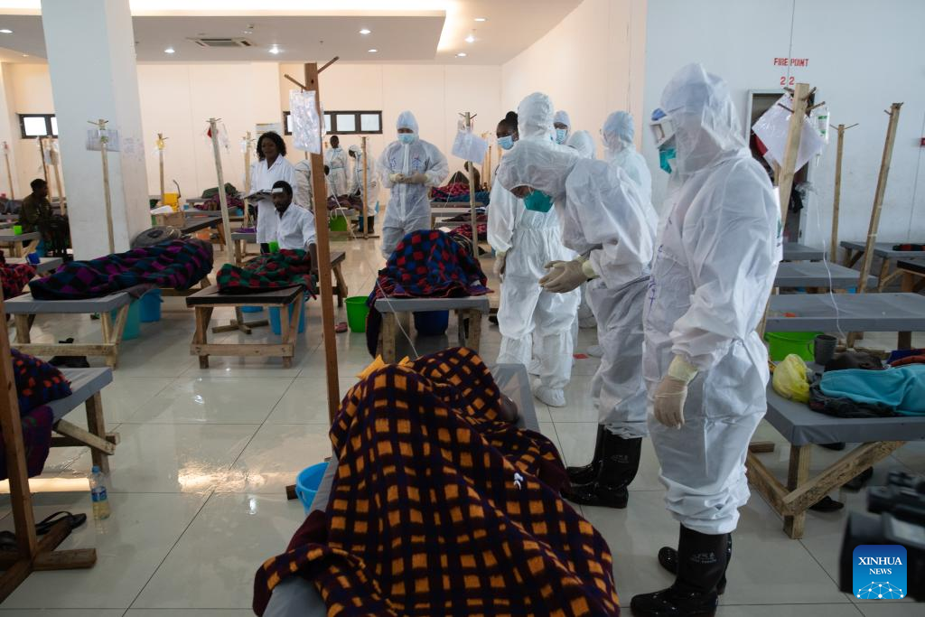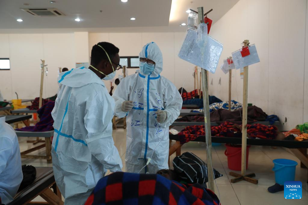Chinese doctors check the condition of patients infected with cholera at the National Heroes Stadium, designated as a Cholera Treatment Center, in Lusaka, Zambia, on Jan. 18, 2024. Chinese doctors joined local health workers on Thursday in providing healthcare services to cholera patients in Lusaka, the Zambian capital. (Xinhua/Peng Lijun)