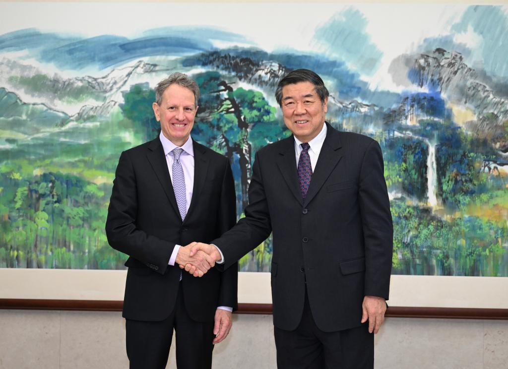 Chinese Vice Premier He Lifeng, also a member of the Political Bureau of the Communist Party of China Central Committee, meets with former U.S. Secretary of Treasury Timothy Geithner, now chairman of Warburg Pincus, in Beijing, capital of China, Jan. 18, 2024. (Xinhua/Zhang Ling)