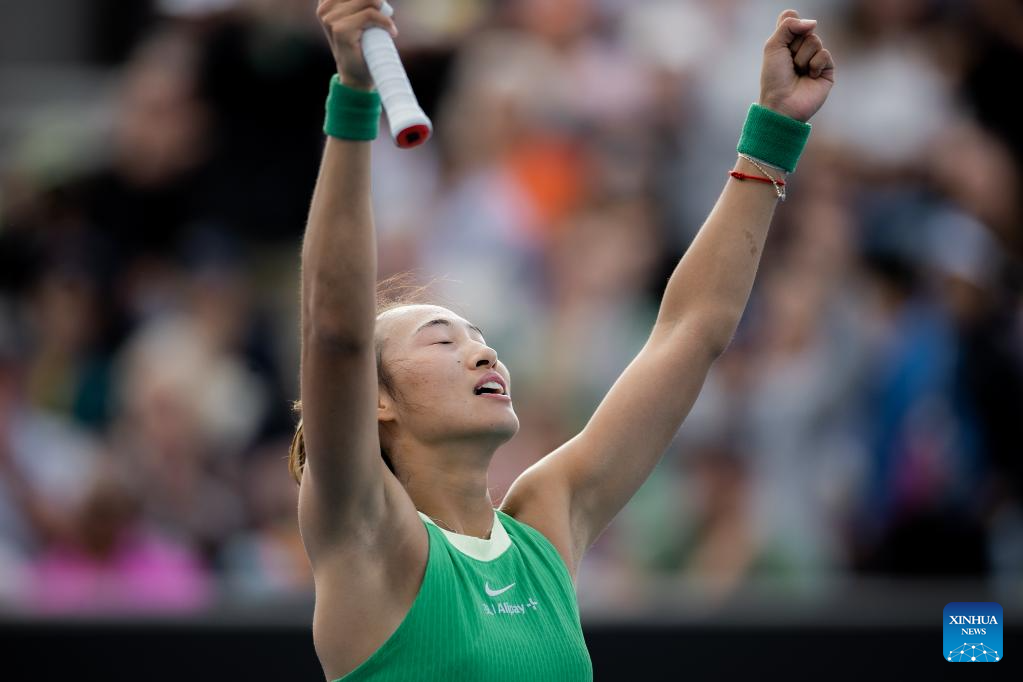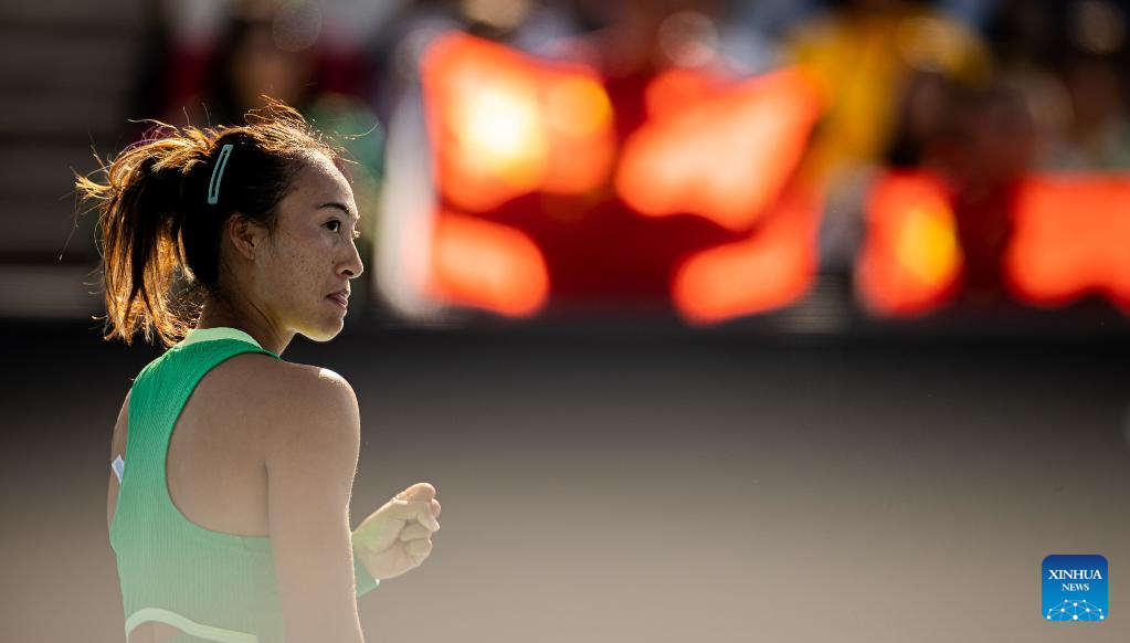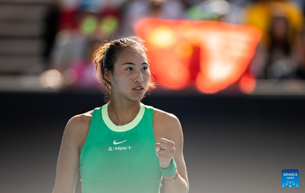 Zheng Qinwen of China celebrates winning after the women's singles second round match between Zheng Qinwen of China and Katie Boulter of Britain at the Australian Open tennis tournament in Melbourne, Australia on Jan. 18, 2024. (Photo by Hu Jingchen/Xinhua)