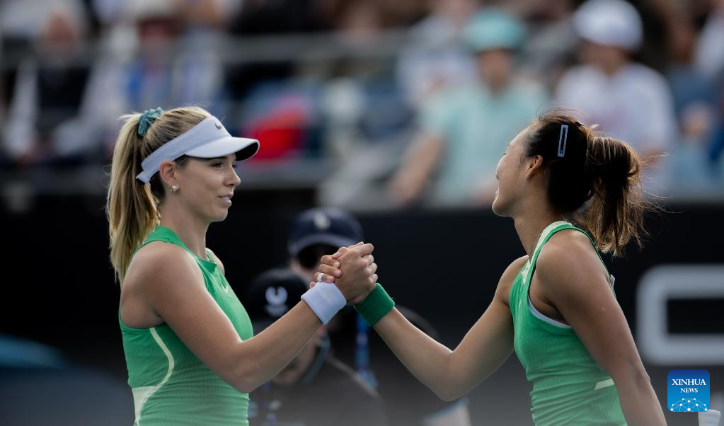 Zheng Qinwen (R) of China greets Katie Boulter of Britain after their women's singles second round match at the Australian Open tennis tournament in Melbourne, Australia on Jan. 18, 2024. (Photo by Hu Jingchen/Xinhua)