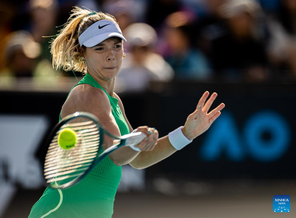 Katie Boulter of Britain hits a return during the women's singles second round match between Zheng Qinwen of China and Katie Boulter of Britain at the Australian Open tennis tournament in Melbourne, Australia on Jan. 18, 2024. (Photo by Hu Jingchen/Xinhua)