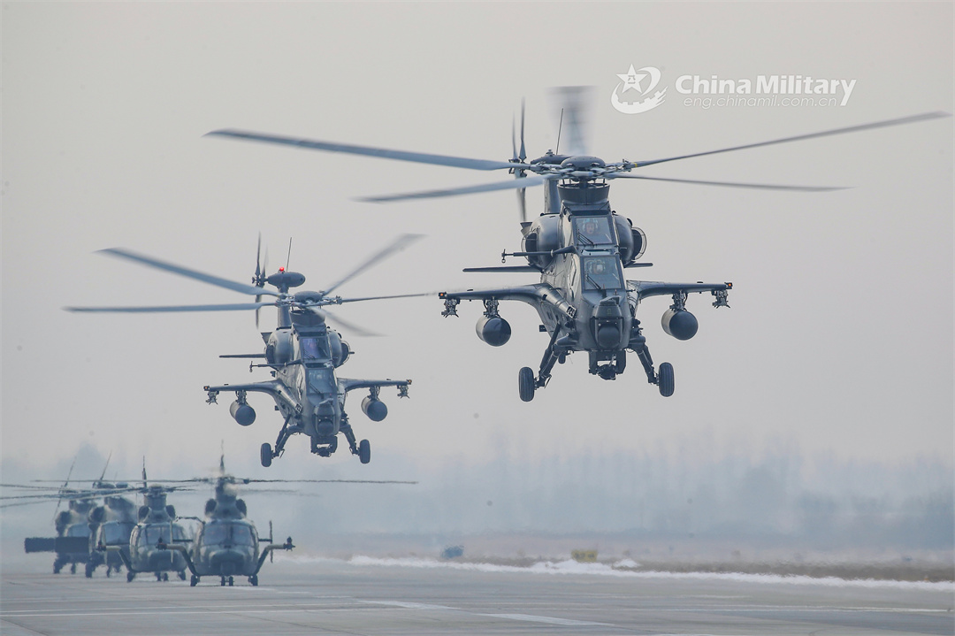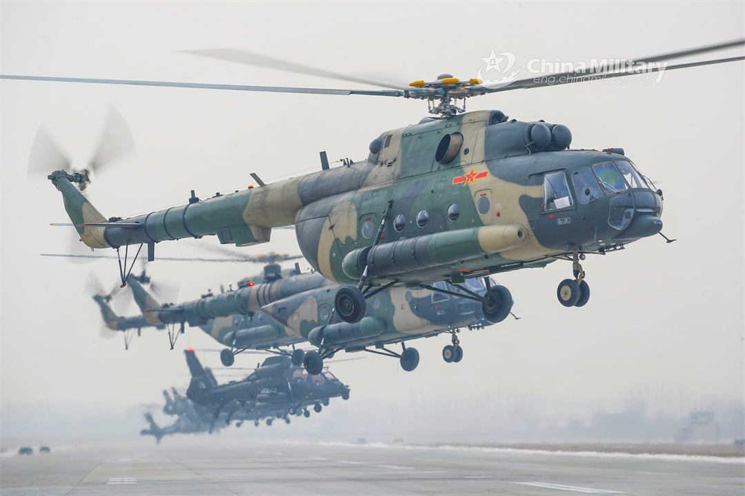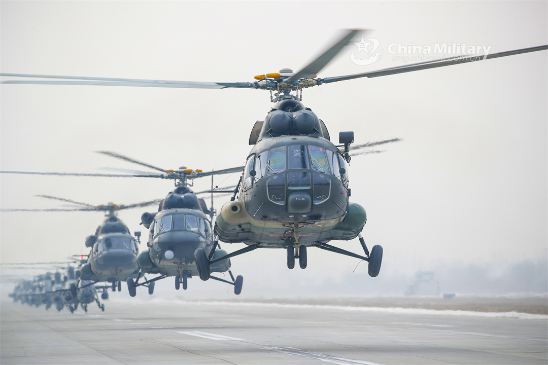 Multiple types of transport and attack helicopters attached to an army aviation brigade under the PLA 81st Group Army lift off successively from the parking apron towards a pre-determined aerial space during a flight training exercise on January 2, 2024. (eng.chinamil.com.cn/Photo by Chen Kai)