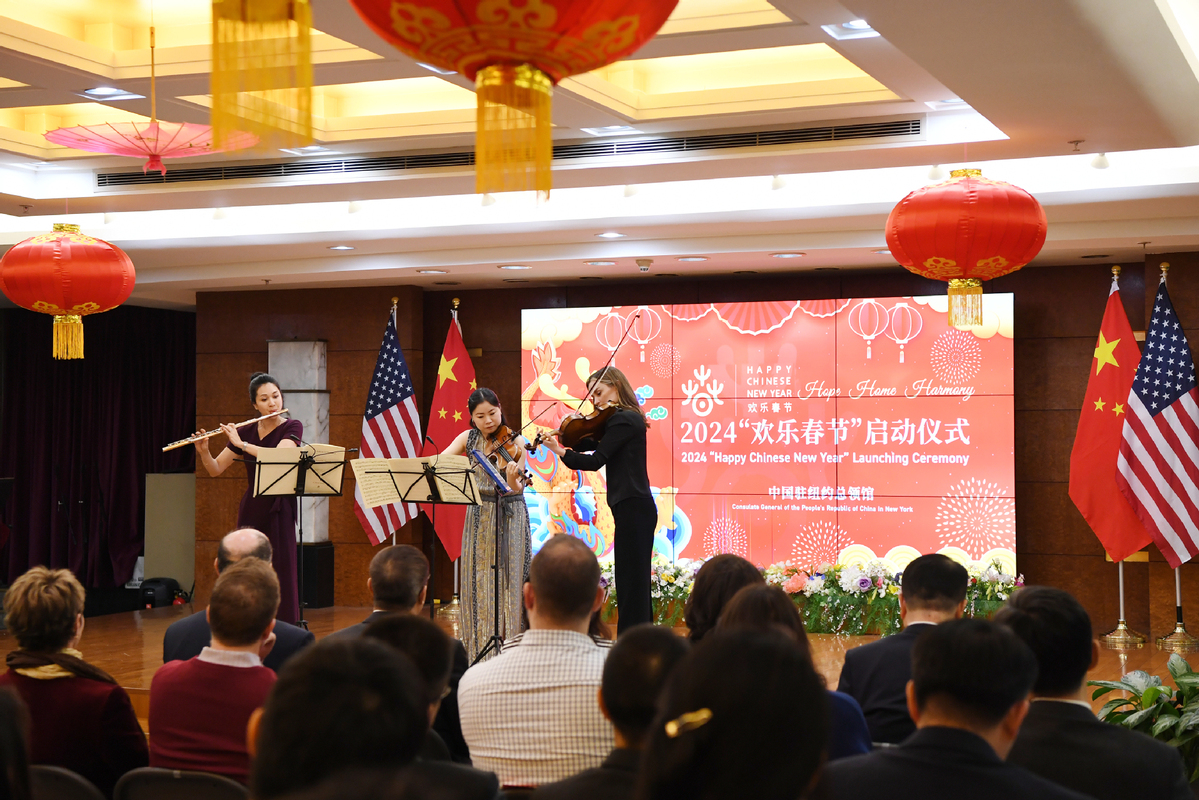 Artists from the New York Philharmonic perform during the 2024"Happy Chinese New Year" launch ceremony at the Chinese Consulate General in New York on Tuesday. LI RUI/XINHUA