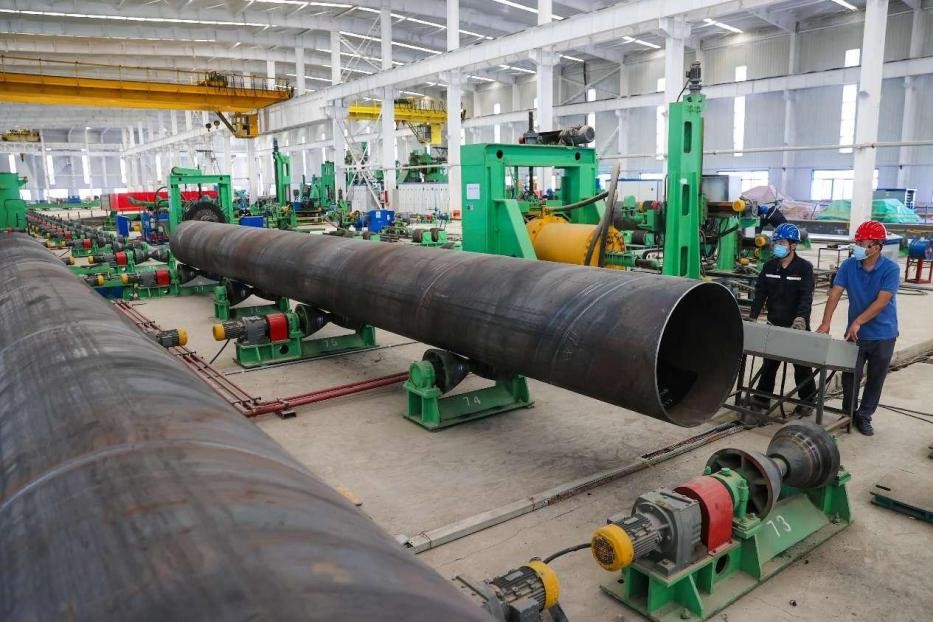 Pipes are produced in a workshop of Xinbo Oil and Gas Pipeline Manufacturing Co., Ltd. in Alashankou, northwest China's Xinjiang Uygur autonomous region. (People's Daily Online/Yusuf Eni)