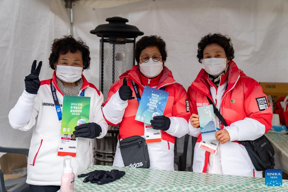 Volunteers for the 2024 Winter Youth Olympic Games pose for a photo in Gangneung, South Korea, Jan. 17, 2024. (Xinhua/Zhang Xiaoyu)