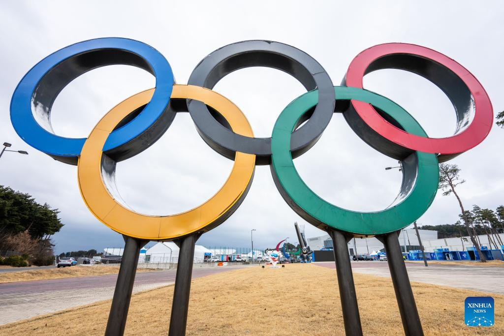 Olympic rings are seen in the Gangneung Olympic Park in Gangneung, South Korea, Jan. 18, 2024. (Xinhua/Zhu Wei)