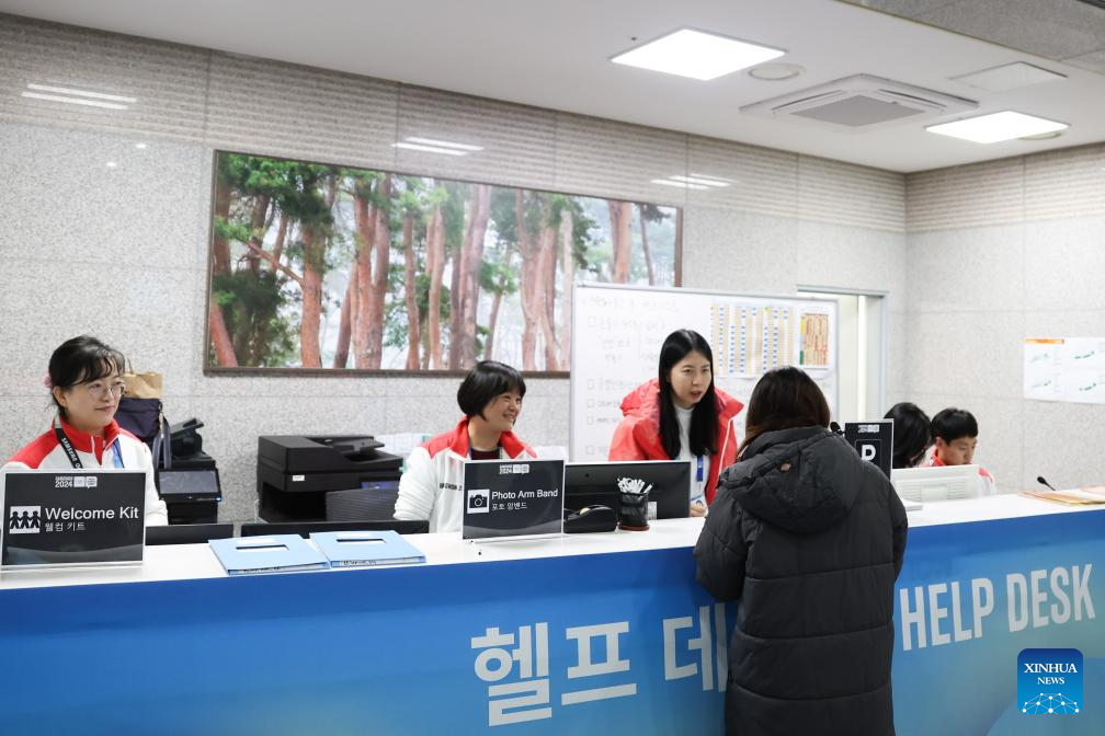 Volunteers work in the main media center of the 2024 Winter Youth Olympic Games (YOG) in Gangneung, South Korea, Jan. 18, 2024. (Xinhua/Xu Yanan)