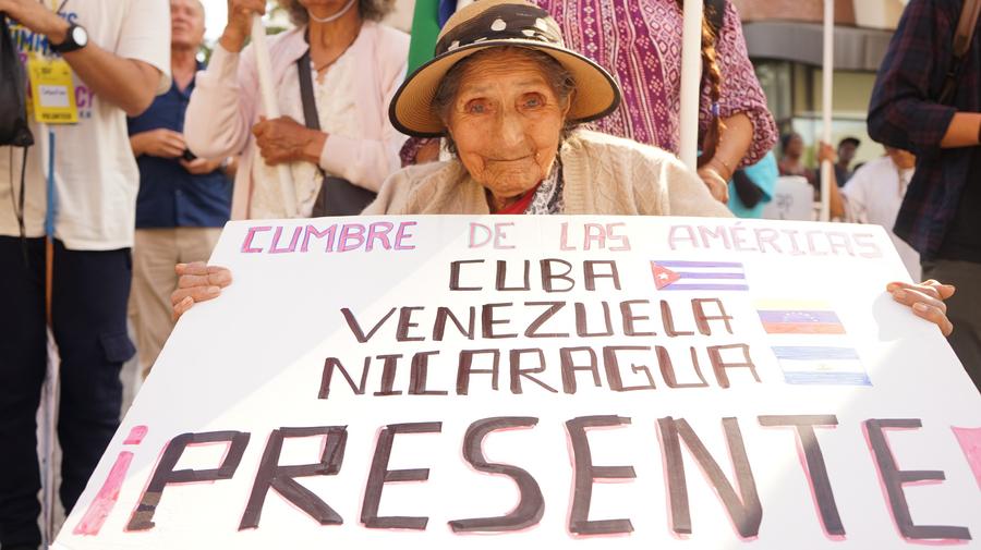 A woman protests against the U.S. refusal to invite leaders of countries such as Cuba, Nicaragua and Venezuela to the U.S.-hosted Summit of the Americas in Los Angeles, the United States, June 10, 2022. (Xinhua)
